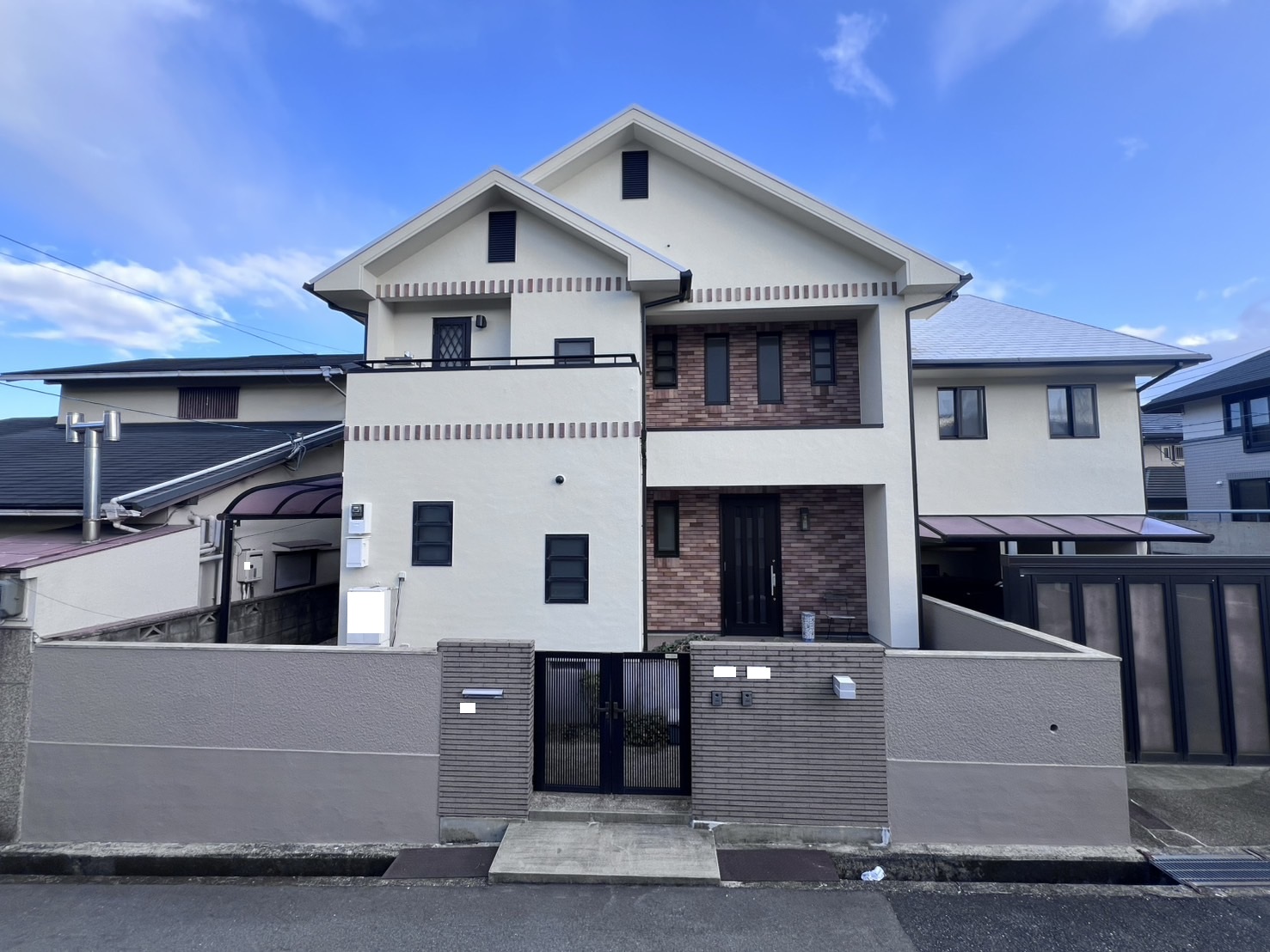 使用塗料 | 屋根塗料:ASTEC/超低汚染リファイン500MF-IR 使用色 パールグレイ 外壁塗料:超低汚染プラチナリファイン2000MF-IR 使用色 ニュートラルホワイト ベイジュ(擁壁) 付帯部塗料:ASTEC/マックスシールド1500F-JY 使用色 チャコール |