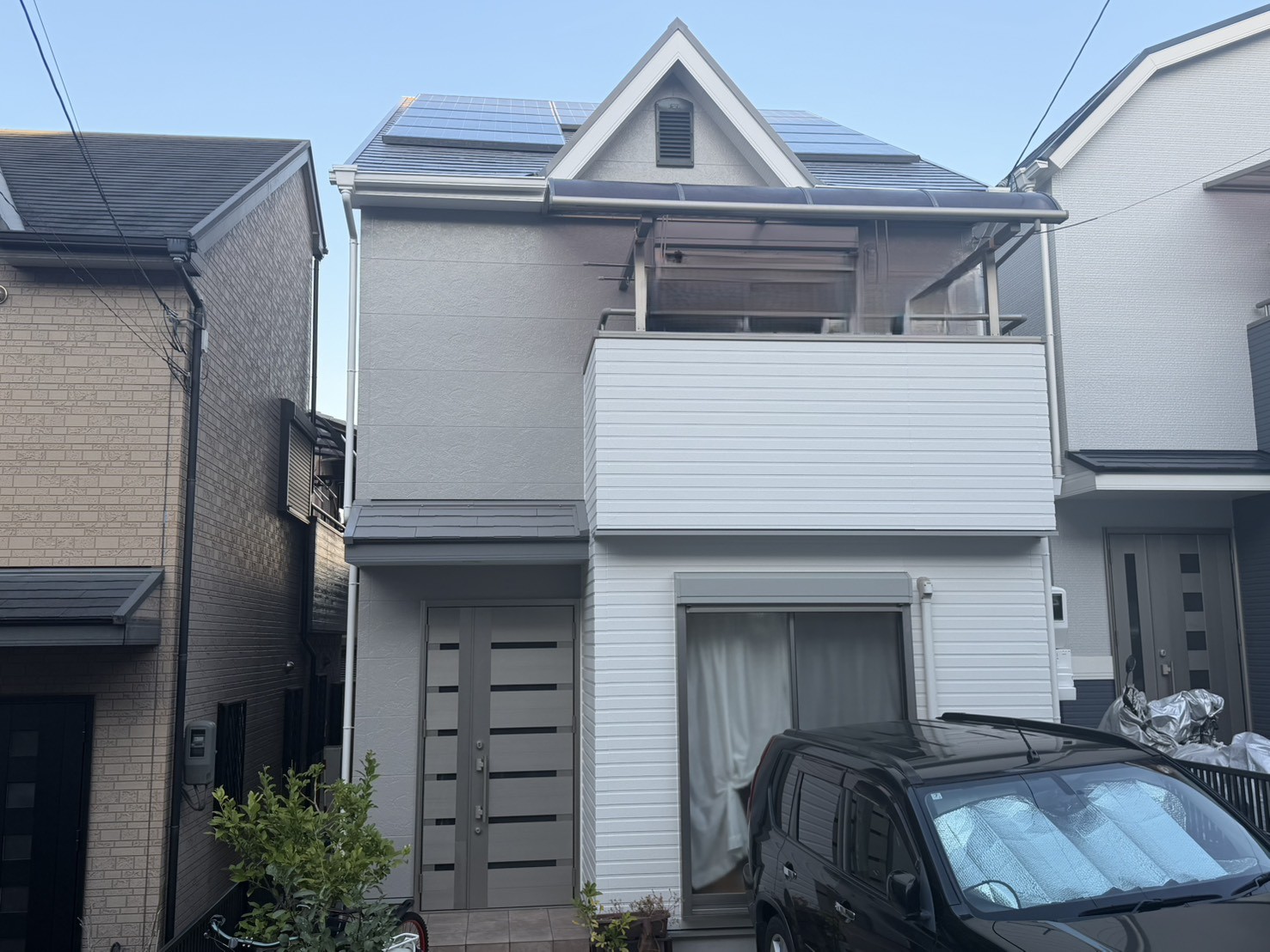 | 使用塗料 | 屋根塗料 ASTEC/超低汚染リファイン500SI-IR 使用色 ミネラルグレイ 外壁塗料 ASTEC/超低汚染プラチナリファイン2000SI 使用色 正面赤枠左側面・クールホワイト 既存白壁・バーチグレー 付帯部塗料 ASTEC/マックスシールド1500SI-JY 使用色 クールホワイト バーチグレー |