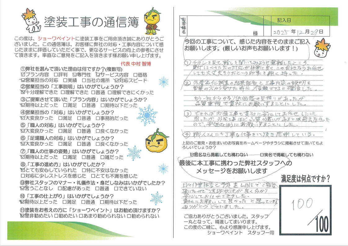 | 使用塗料 | 屋根塗料 ASTEC/スーパーシャネツサーモSI 使用色 クレタグレー 外壁塗料 ASTEC/プラチナシリコンREVO2000-IR 使用色 モルタル面・ホワイトリリィ サイディング面・ベイジュ艶有 付帯部塗料 ASTEC/マックスシールドネオSI 使用色 メリーノ(帯) チャコール(雨戸・出窓・シャッターBOX) 玄関扉(クールホワイト) |