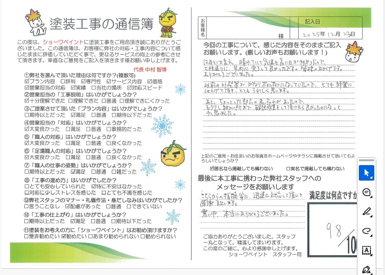 天候にも恵まれ、無事に年内に工事を完了できましたこと、私どもも大変うれしく思っております。仕上がりにもご満足いただけたとのこと、何よりの励みになります。